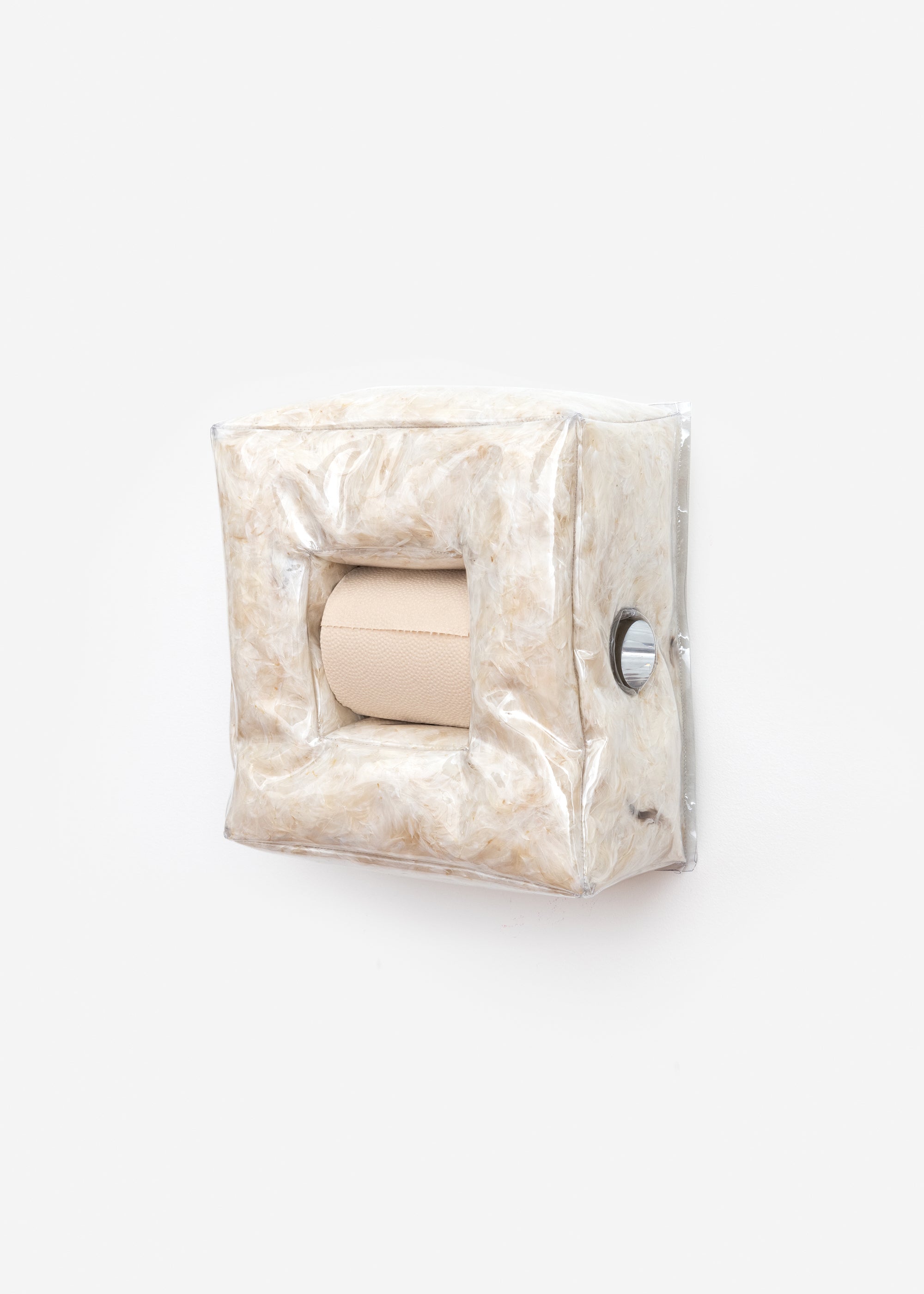 화장지 베개는 부드러운 조각의 기능적인 작품이다. 대부분의 욕실에서 샤워 커튼 라이너로 흔히 볼 수 있는 투명 비닐은 화장지를 받칠 수 있도록 정확한 모양으로 꿰매어져 있습니다. 아크릴 막대가 화장지 롤을 고정하고 비닐 구조에 달라붙어 단단히 고정됩니다. 거위털은 무게를 추가하지 않고도 구조를 채우고 지지하는 데 사용됩니다. 구스다운은 또한 임상 비닐 벽 뒤에 동물적인 질감과 운동감을 제공합니다. 전반적인 인상은 고급스럽고 매력적이면서도 다소 당황스러운 초현실적인 베개 조각품입니다.