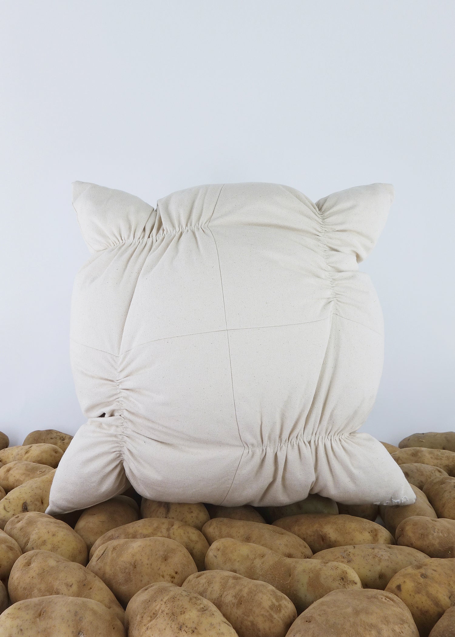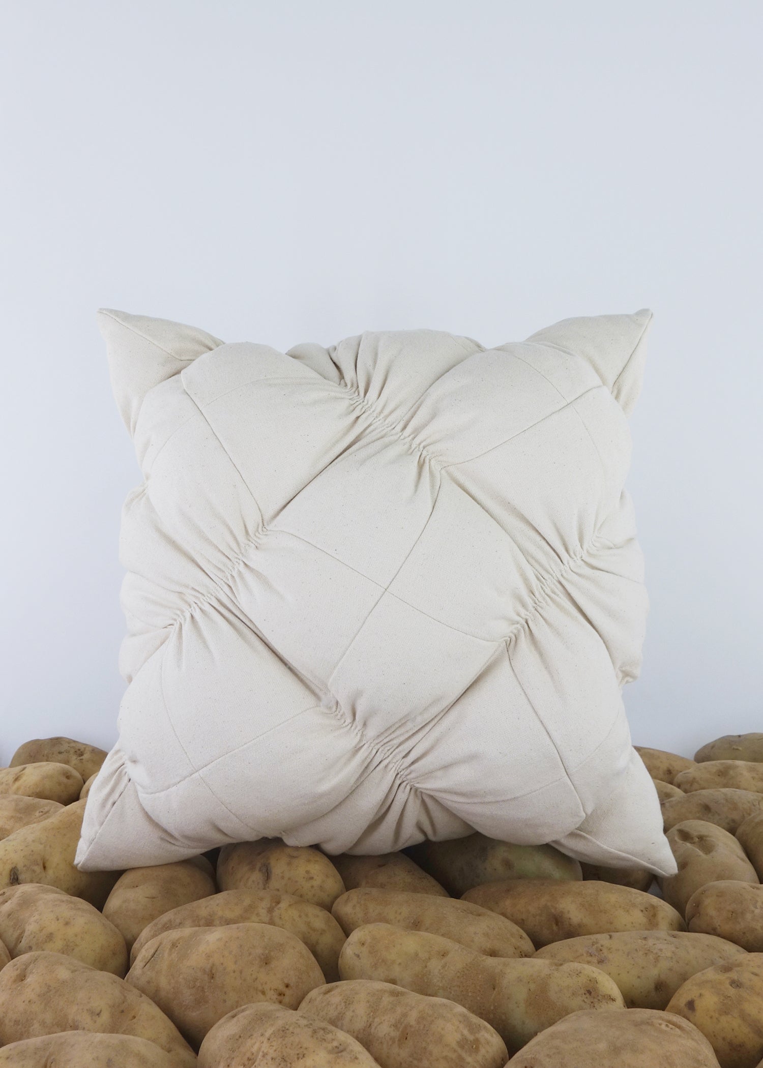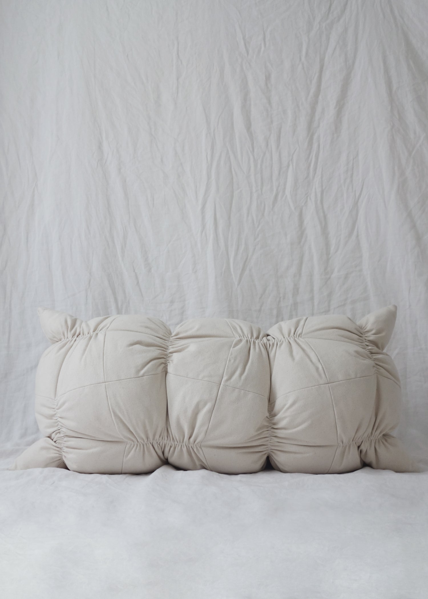 Ruching은 친숙한 사각형 베개를 좀 더 감각적이고 거슬리는 것으로 조작하는 데 사용됩니다. 다양한 방식으로 탐구된 이 시리즈는 주름진 사각형의 반복을 활용하여 베개 볼륨 전체에 균형 잡힌 긴장감을 조성합니다. 루칭은 여성 기성복에서 볼륨을 조절하기 위해 자주 사용됩니다. 즉, 옷이 몸에 더 가깝거나 몸에서 멀어지도록 돕습니다. 인테리어에서 러칭은 커튼, 테이블 스커트, 의자 등 화려한 장식과 더 많이 연관되어 있습니다. 이 시리즈는 그러한 의미를 지우는 것을 목표로 합니다. 주름진 스티치로 인해 충전재가 베개의 어색한 주머니를 차지하게 되며, 강화된 스티치의 강도와 직물의 짜임새를 모두 활용하여 모든 것을 제자리에 고정합니다. 그렇지 않으면 베개는 이 긴장으로 인해 무너질 수 있습니다. 그러나 통제된 혼돈의 상태는 매력을 만들어냅니다. 그들은 약간 당황스러우면서도 부드러운 형태를 만들기 위해 끊임없이 긴장감을 유지하고 있다.