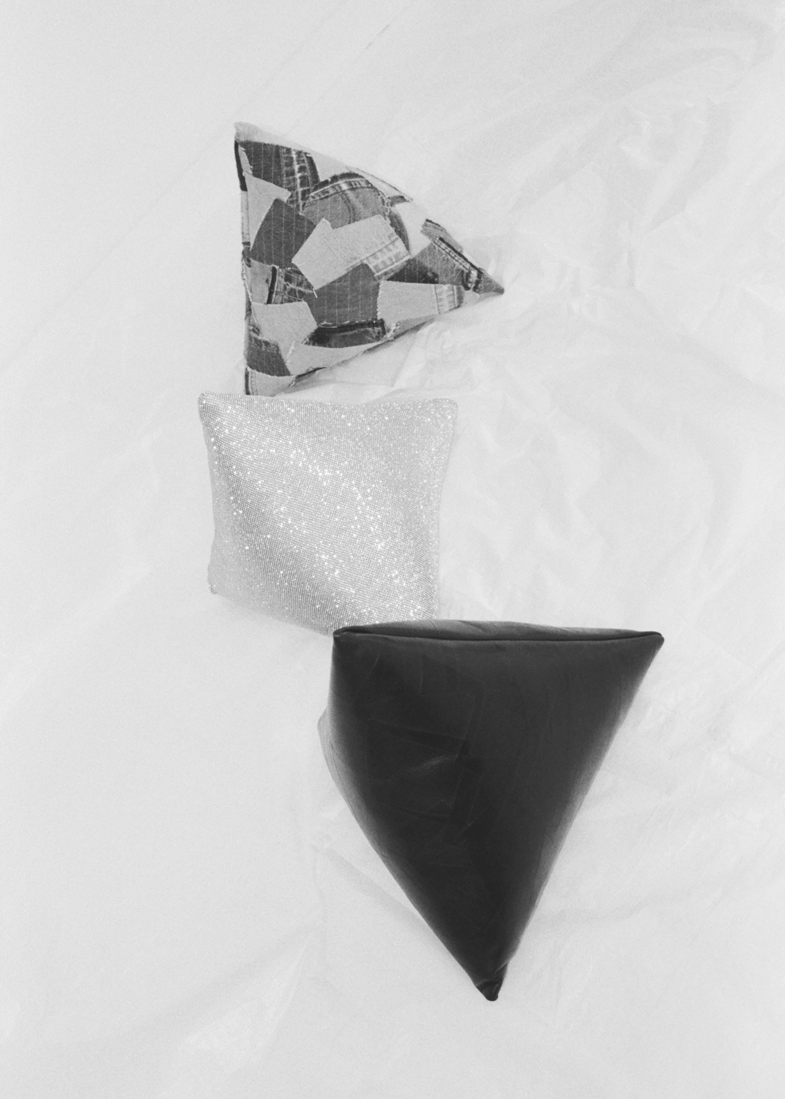 Sohn collaborated with New York based accessories brand Kara on limited edition pillows. Hand pillows were fabricated in Kara's materials, including their signature crystal mesh as well as new upcycled denim and leather fabrications.